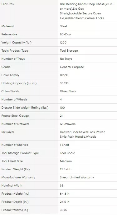 - When you buy a 36 in. W 12-Drawer, Deep Combination Tool Chest and Cabinet Set in Gloss Black online from Our Store, we make it as easy as possible for you to find out when your product will be delivered.If you have any questions about your purchase or any other product for sale, our customer service representatives are available to help.Whether you just want to buy a or shop for your entire home, Our Store has a zillion things home.