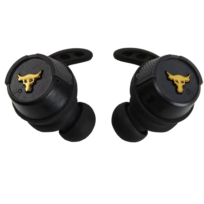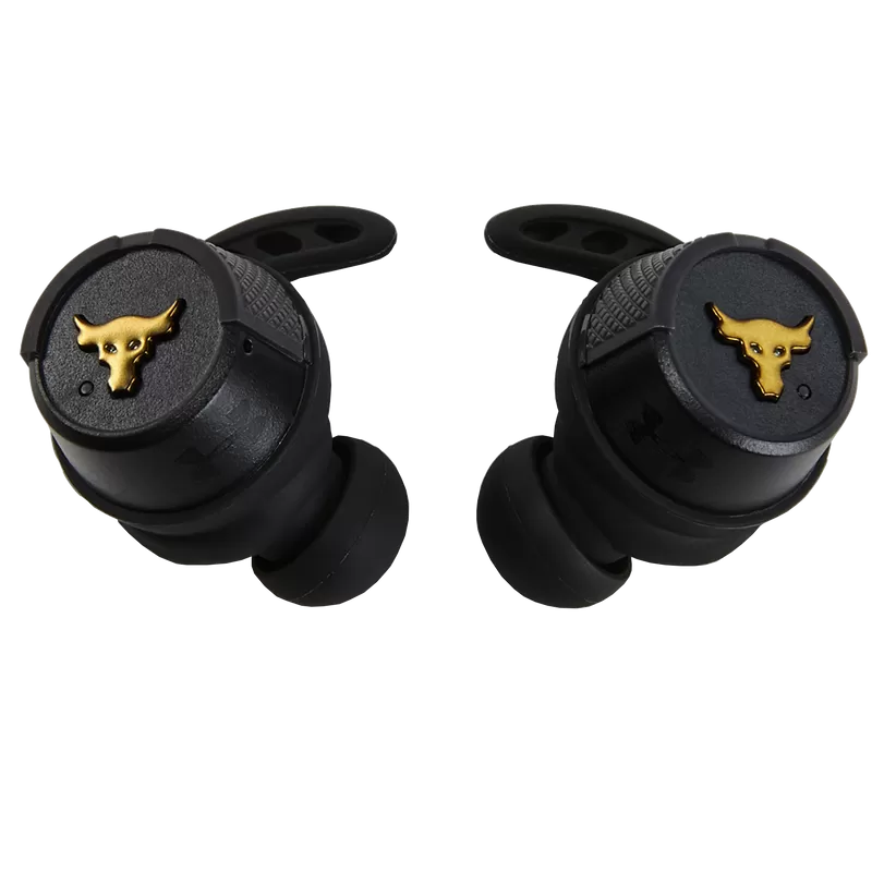 UA Project Rock True Wireless offers a truly cord-free experience built for the grind. UA Storm waterproof technology and Antibacterial Sport Flex Fit ear tips were crafted specifically for all-condition training while the JBL Charged Sound was boldly optimized and tuned with rich bass for motivation. Hear your surroundings with Bionic Hearing featuring TalkThru Technology for quick conversations with just one touch, and AmbientAware Technology to hear your surroundings for increased safety. With up to 25 hours battery life and a rugged aluminum charging case, these headphones truly break the limits.