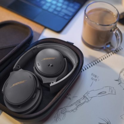 Up to 22 Hours of Battery Life: Enjoy up to 22 hours of battery life on a single charge. A 15-minute quick charge provides 3 hours on the go, or plug in the included audio cable for longer listening in wired mode. Personalize Your Audio: Adjustable EQ allows you to set bass, midrange, and treble levels to your personal preference, or choose one of several preset options. BOSE SIMPLE SYNC TECHNOLOGY: SimpleSync pairs your Bose QuietComfort 45 headphones with select Bose Smart Soundbars for a personal TV listening experience. A separate volume control lets you lower or mute your soundbar while keeping your headphones as loud as you want. Get away from your phone. Press and hold the Bluetooth button on each device to sync their sounds. Already got a bunch of people started. Connect by pressing the action button.