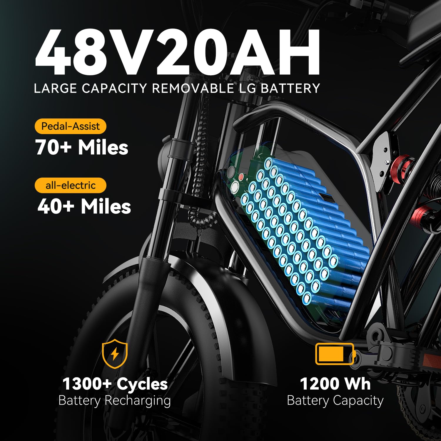 - 【Long-Lasting 48V Removable Battery】Equipped with a high-capacity 48V 20AH battery, this e-bike delivers an impressive range of up to 80miles on a single charge.Equipped with a 48V 30AH high-capacity battery, it delivers a range of 80-150 miles on a single charge. Ensuring long commutes and extended rides without the worry of running out of power. Detachable design allows the battery to be easily removed from the e-bike and charged indoors