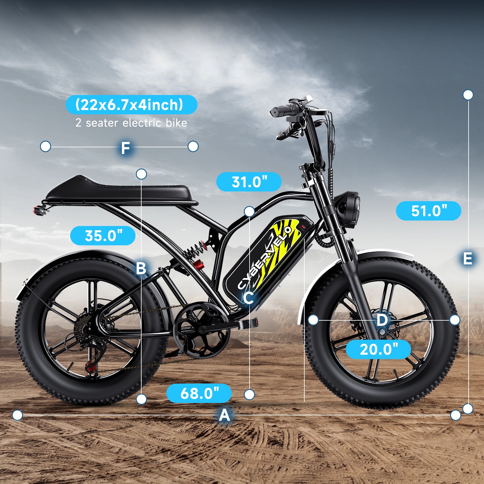 - 【20"*4.0" Fat Tires for All-Terrain Stability】This e-bike is designed to tackle a variety of surfaces, from smooth city streets to rough terrains like gravel and dirt. The durable 20'' x4.0" fat tires offer superior grip and stability, ensuring a smooth, controlled ride even on uneven or challenging surfaces.
