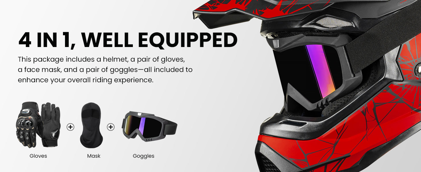 - 4 in 1 Package: Each adult motocross helmet comes with a pair of motorcycle gloves, a balaclava face mask, and a set of tinted goggles to provide complete protection from wind, dust, and glare light