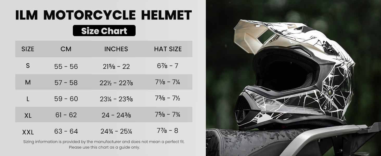- Safety and Size: The ILM WS901 dirt bike helmet meets DOT and FMVSS 218 safety standards. Available sizes include: Adult-S (550 - 560 mm / 21-5/8' - 22'); Adult-M (570 - 580 mm / 22-1/2' - 22-7/8'); Adult-L (590 - 600 mm / 23-1/4' - 23-5/8'); Adult-XL (610 - 620 mm / 24' - 24-3/8'); and Adult-2XL (630 - 640 mm / 24-3/4' - 25-1/4')