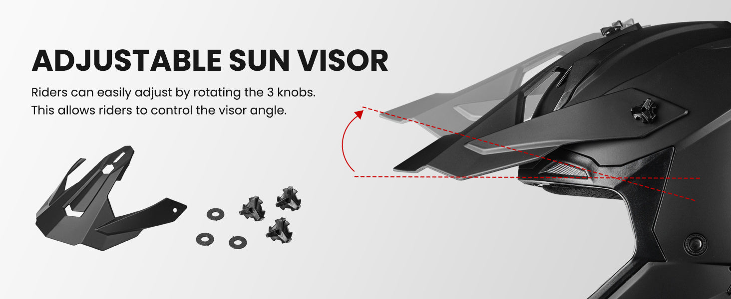 - Adjustable Sun Visor: The visor angle can be effortlessly adjusted using the knob located at the top of the ATV helmet. This feature effectively blocks glare and optimizes visibility under varying light conditions