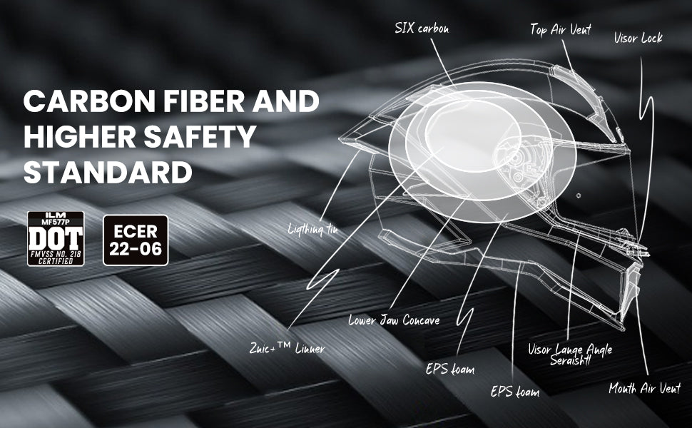 - Carbon Fiber: 6 layers of hand-laid carbon fiber combined with lightweight composite fibers means exceptional lightness and greater impact resistance, making the motorcycle helmet effortless to wear.