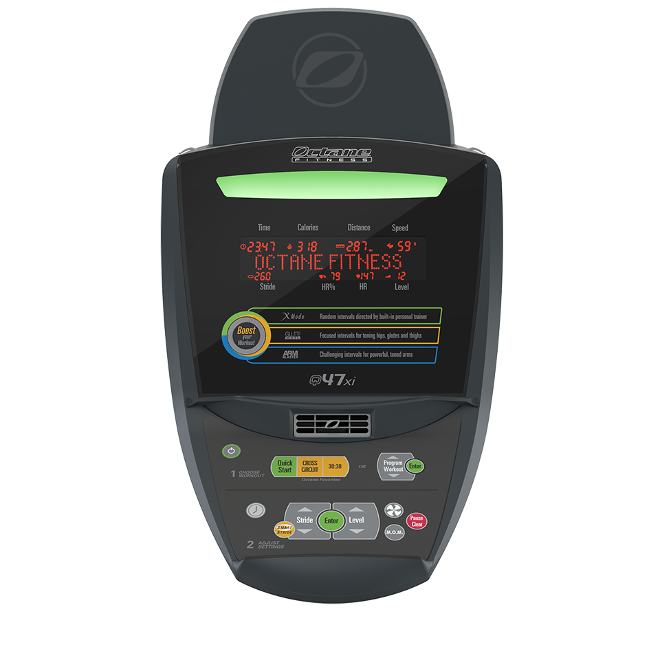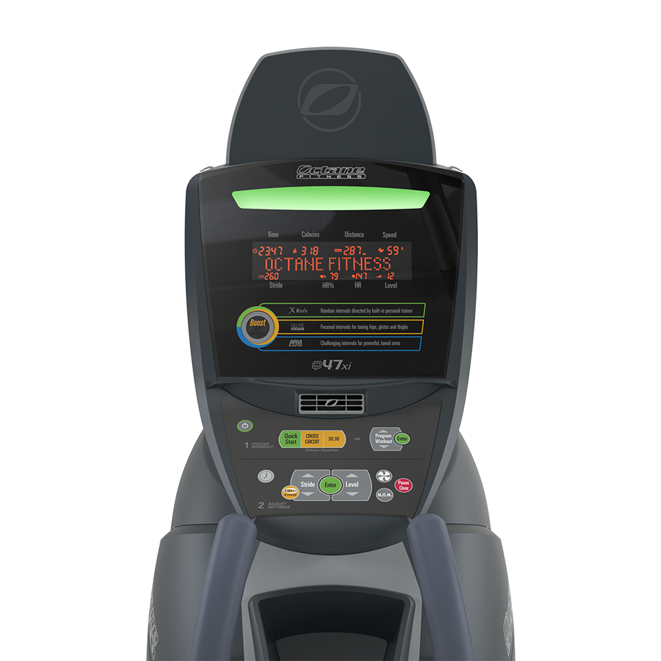 The Q47xi standing elliptical is a complete package – real-running motion based on precise human biomechanics, multi-grip handlebars, and a space-efficient design. Experience the Q47xi with the Octane smart console and SmartStride technology, along with Octane’s signature workout boosters, programs, and real-time feedback at your fingertips.