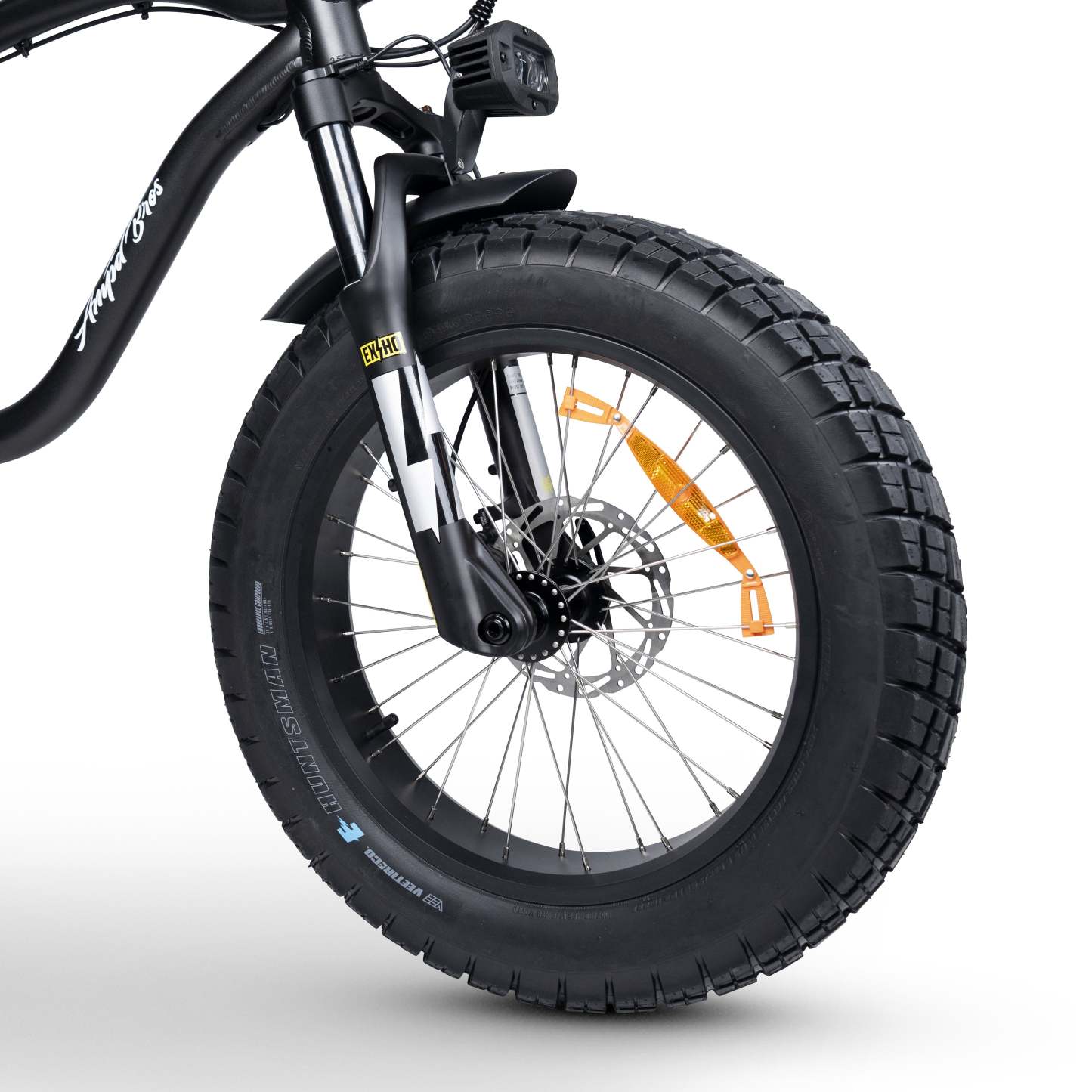 Upgraded with a more powerful High Torque 80N.M Bafang Motor, the Stubbie Pro delivers impressive torque and speed, ensuring you can tackle any terrain with ease. The adjustable suspension forks provide a smooth and comfortable ride, while the premium Vee Tire Huntsman Tyres offer superior grip and durability, making off-road adventures more thrilling than ever.